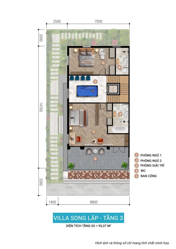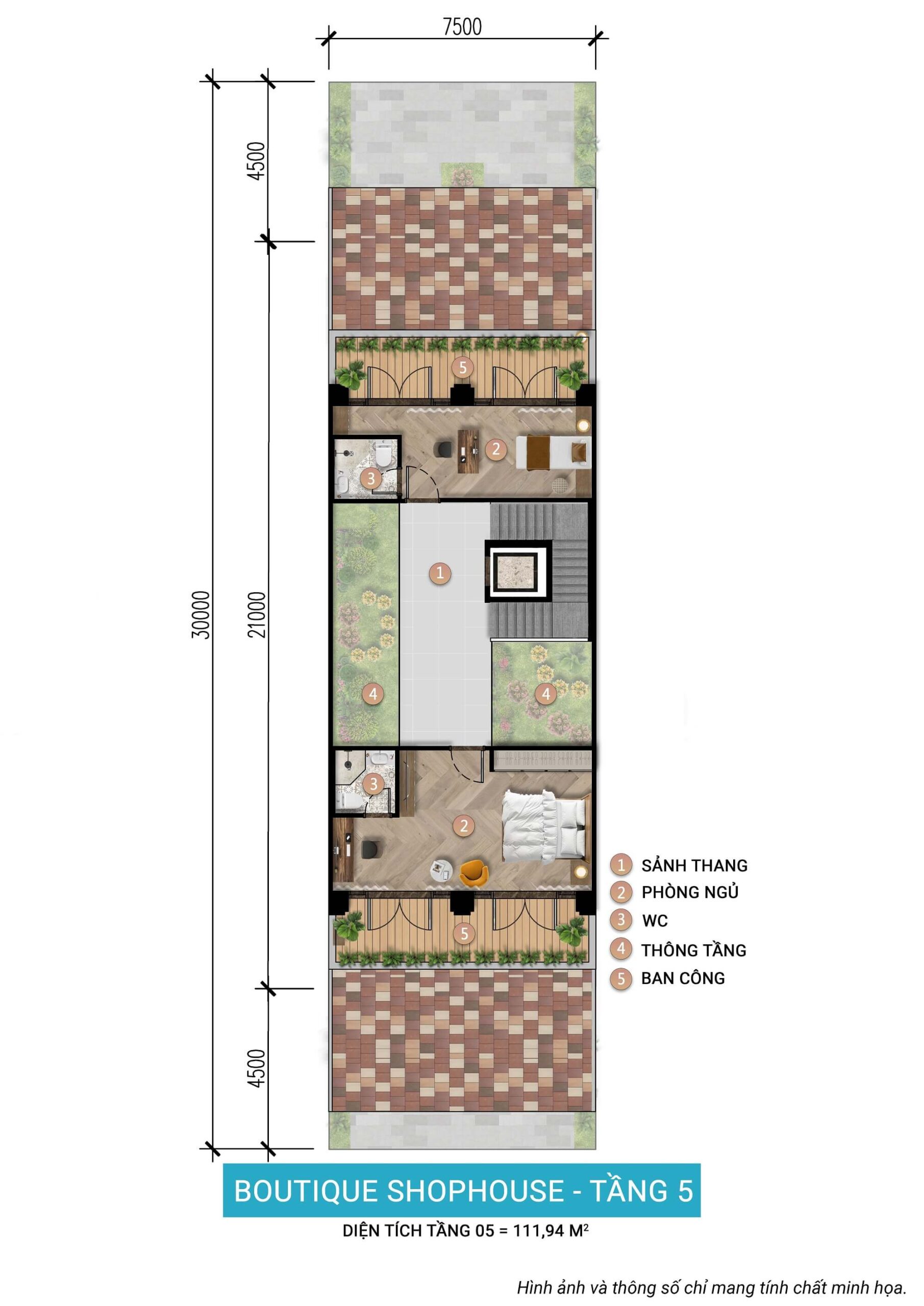 - Diện tích: Tim tường 114.75m² / Thông thủy 106.89m².
