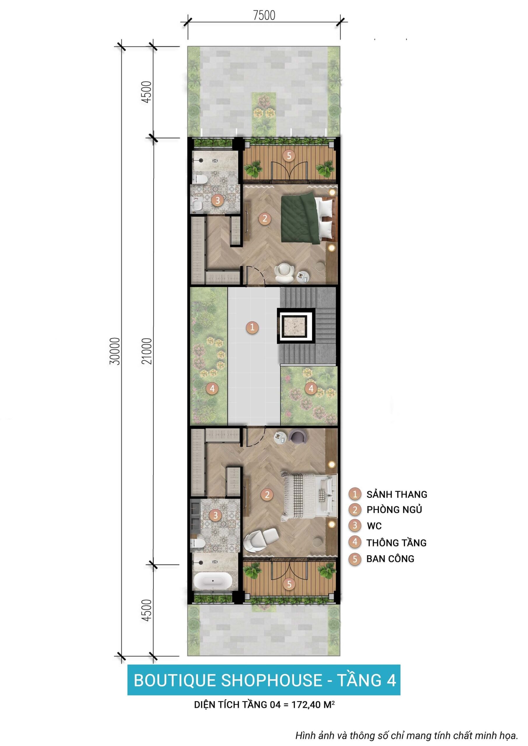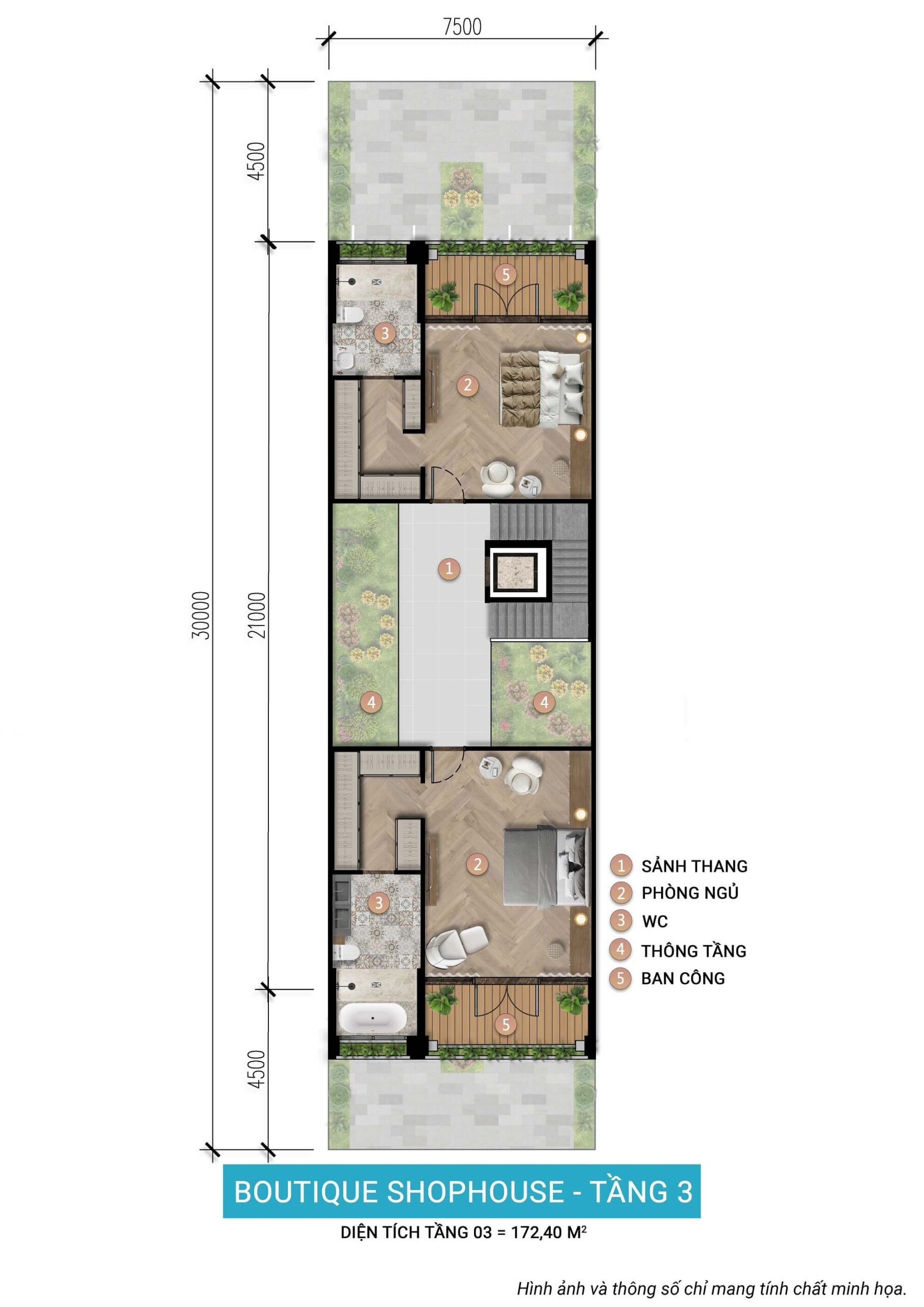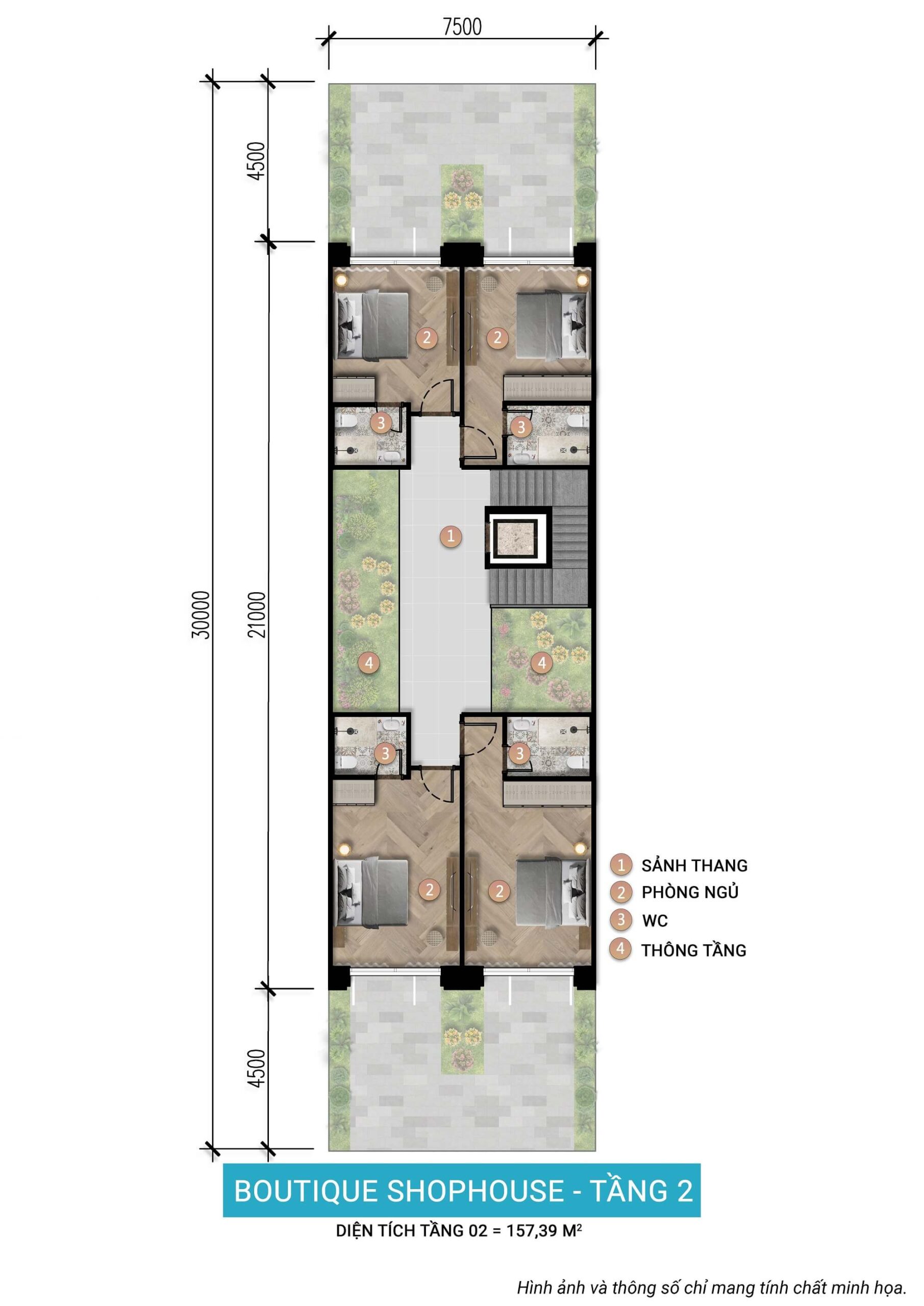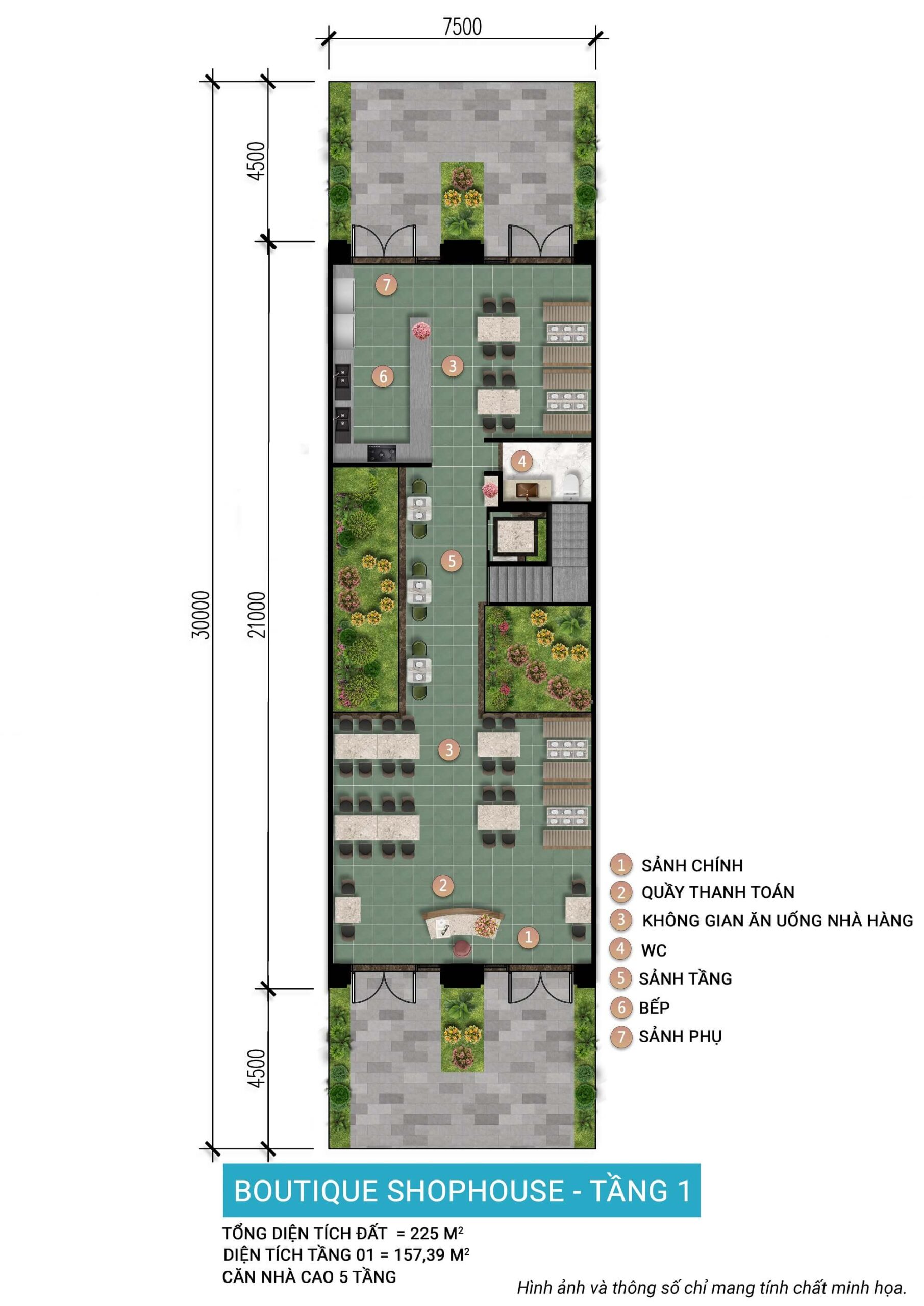 - Trục Đại lộ Townhouse: Diện tích từ 112,5m2 – 150m2 (7.5×157.5×15; 7.5×207.5×20).